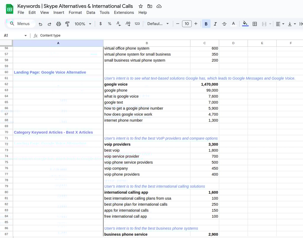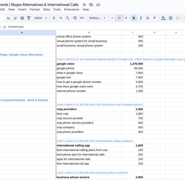Comprehensive spreadsheet organized by page type and search intent clusters with search volume data
