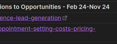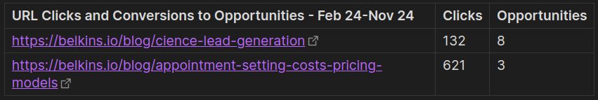 Here's some performance data for 2 different articles I published for a client and the number of clicks and CRM-qualified opportunities they achieved over a 9-month period.